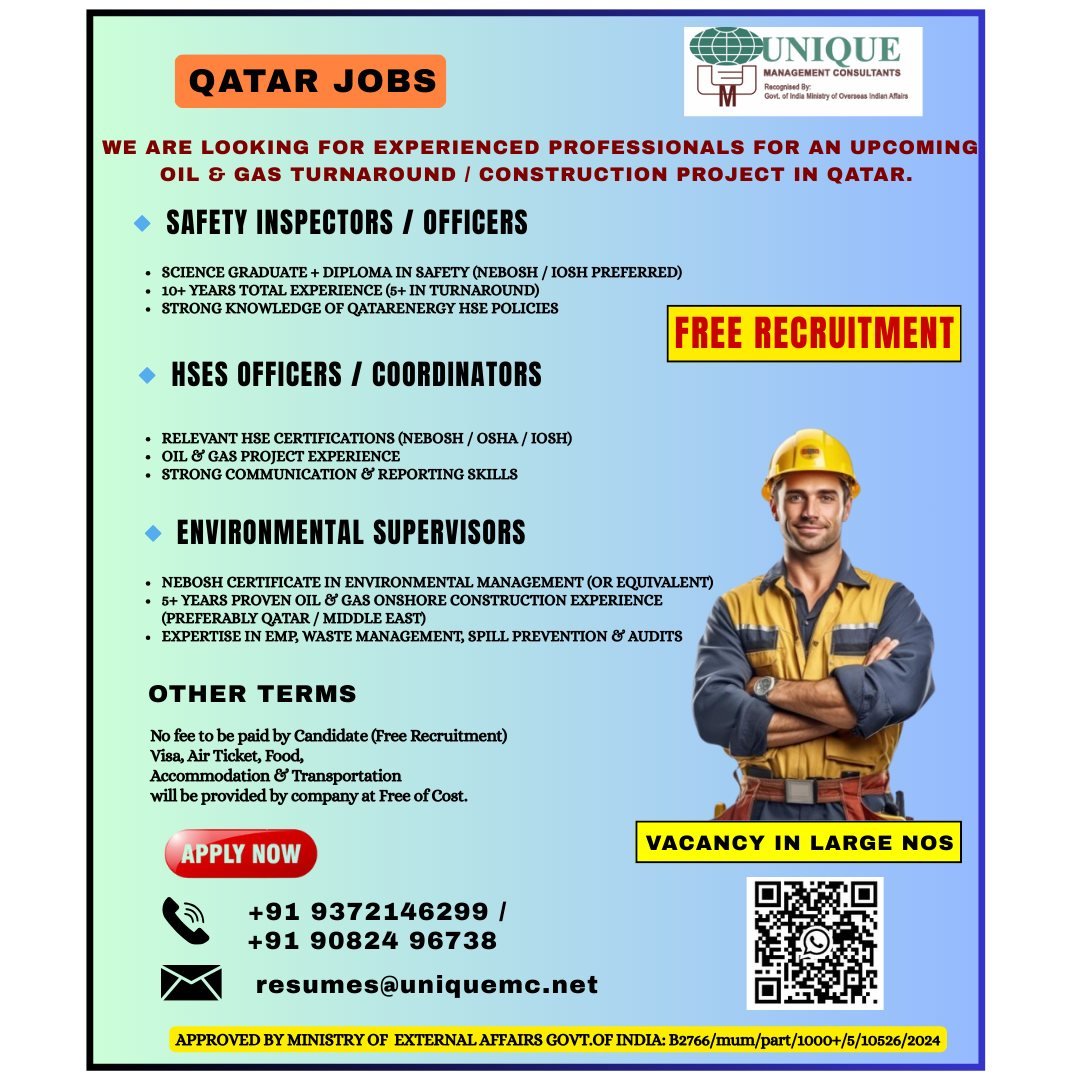 Looking for job opportunities in Qatar? Unique Management Consultants is seeking experienced professionals for an upcoming Oil & Gas Turnaround / Construction Project. With a free recruitment process and vacancies in large numbers, this is your chance to join a thriving industry. Apply now!