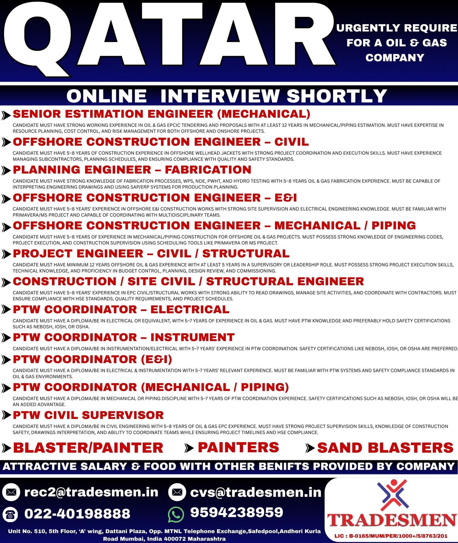 Urgent requirement for a leading Oil & Gas company in Qatar! Online interviews shortly. Attractive salary + food + full benefits provided. Only candidates with Oil & Gas (especially offshore) experience apply.