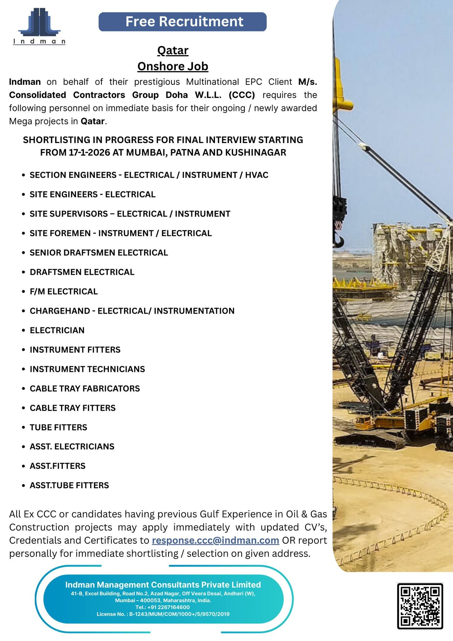 Exciting career opportunities in Qatar! Indman Management Consultants is conducting free recruitment for onshore positions with their prestigious multinational EPC client, Consolidated Contractors Group (CCC), Doha, Qatar. These roles are for ongoing and newly awarded mega projects in the Oil & Gas construction sector.
