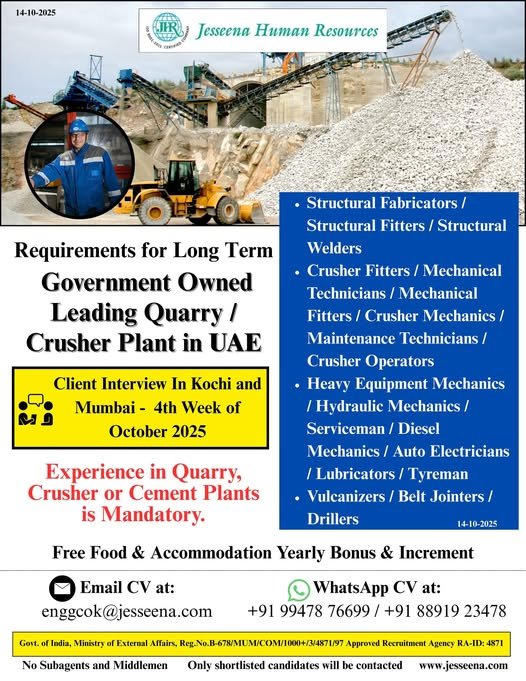 Experience in Quarry, Crusher or Cement Plants is Mandatory.