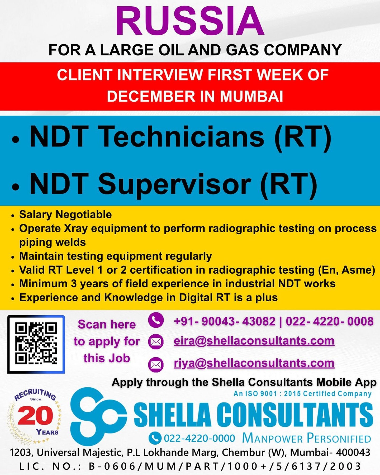 RUSSIA – LARGE OIL AND GAS COMPANY Shella Consultants – ISO 9001:2015 Certified & Govt. Licensed (LIC No: B-0606/MUM/PART/1000+/5/6137/2003) announces urgent requirement for NDT RT Technicians & Supervisor.