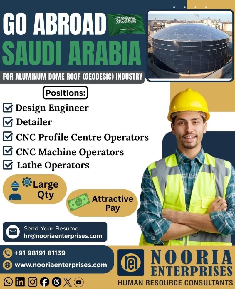 Looking to work abroad in Saudi Arabia? Nooria Enterprises Human Resource Consultants is offering exciting opportunities in the aluminum dome roof (geodesic) industry. With a large quantity of vacancies and attractive pay, this is your chance to join a thriving sector.