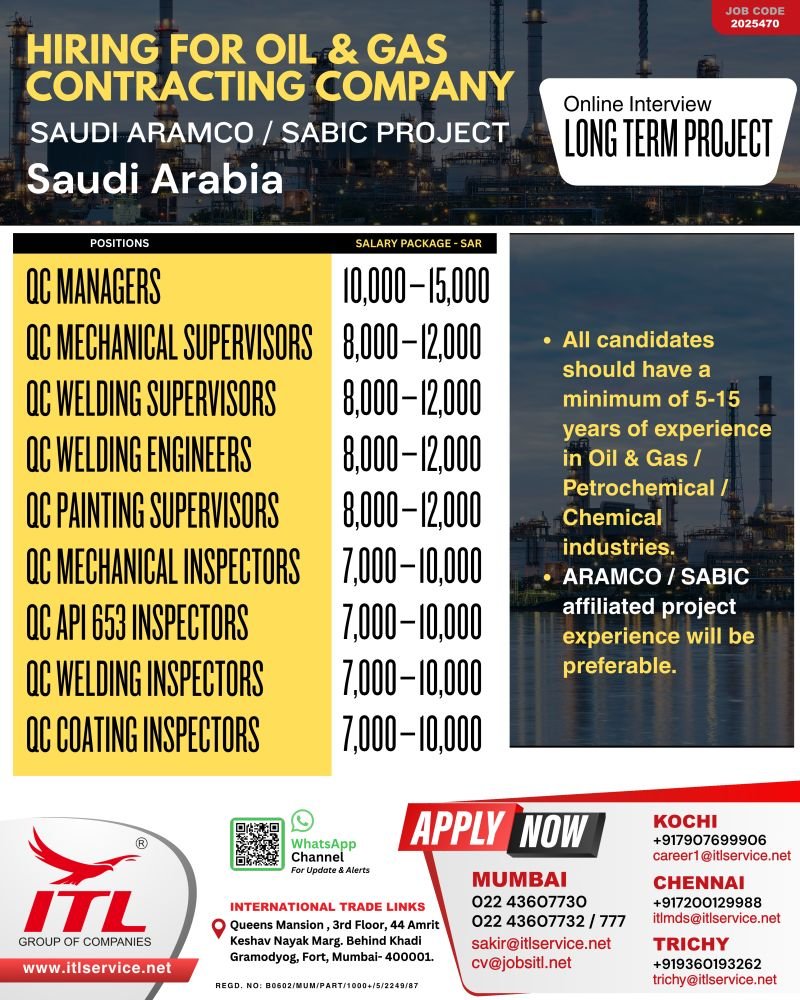 A leading Aramco & SABIC approved Oil & Gas Contracting Company is urgently hiring highly experienced QC professionals for long-term projects in Saudi Arabia.