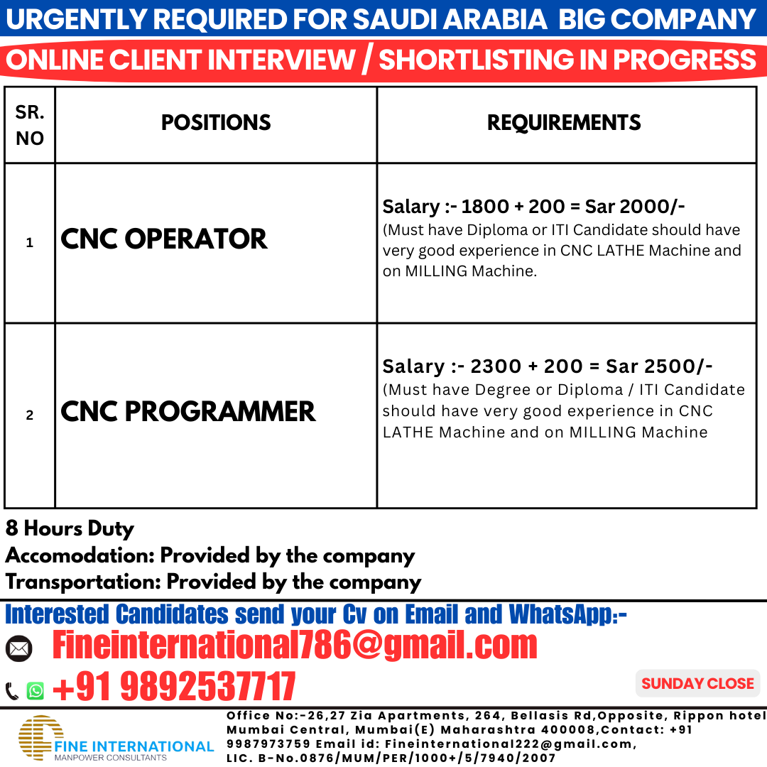 Urgent requirement for a big Saudi Arabian company! Online client interview & shortlisting in progress. Excellent opportunity for skilled CNC Lathe & Milling Machine experts.