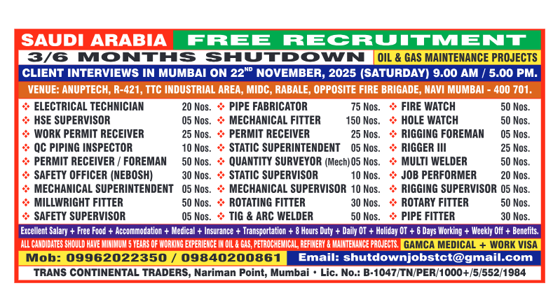 Massive Hiring Alert! Over 1,000+ vacancies in Saudi Arabia for 3/6 months shutdown projects in Oil & Gas Maintenance. Client interviews are scheduled in Mumbai on 22nd November 2025 (Saturday) from 9:00 AM to 5:00 PM. This is a 100% FREE recruitment – no placement fees!