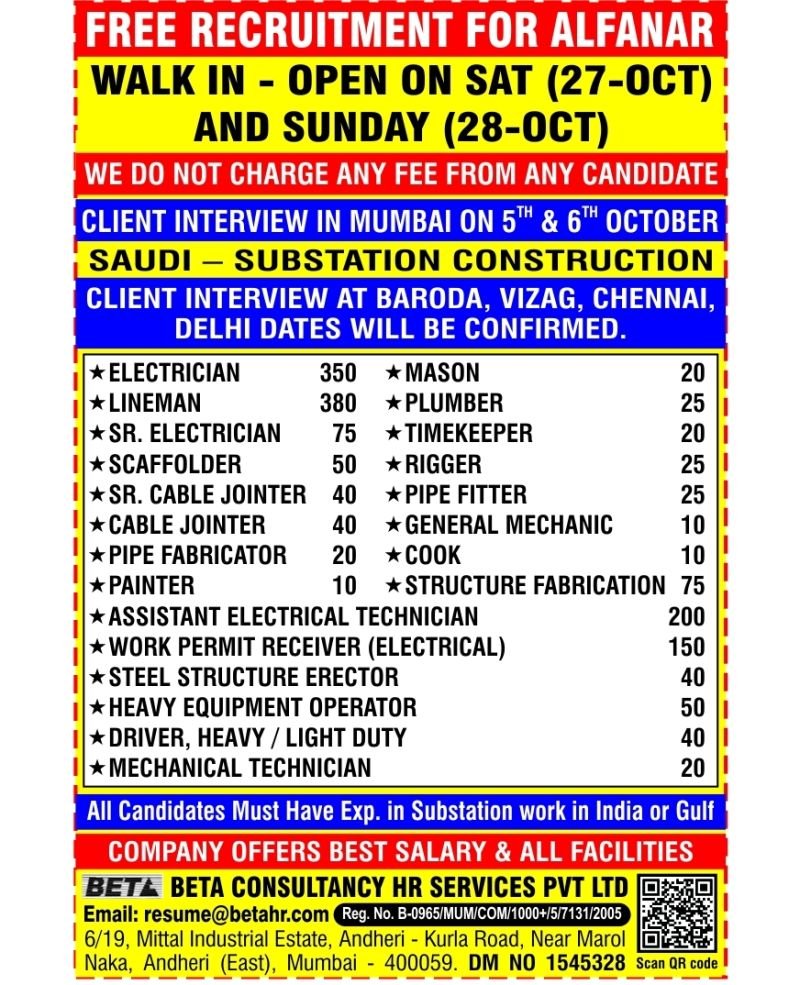 Walk-in to our MUMBAI office for shortlisting and scheduling interview OR send biodata and document copies to Email: resume@betahr.com