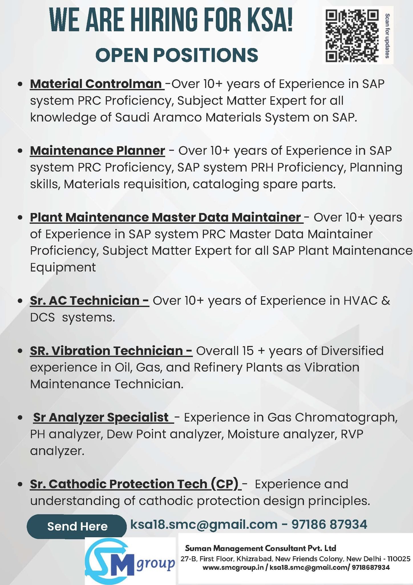 Suman Management Consultant Pvt. Ltd. is urgently recruiting highly experienced professionals for Kingdom of Saudi Arabia (KSA) in the Oil, Gas, and Refinery sector. Candidates with over 10-15 years of relevant experience are required for these senior roles.