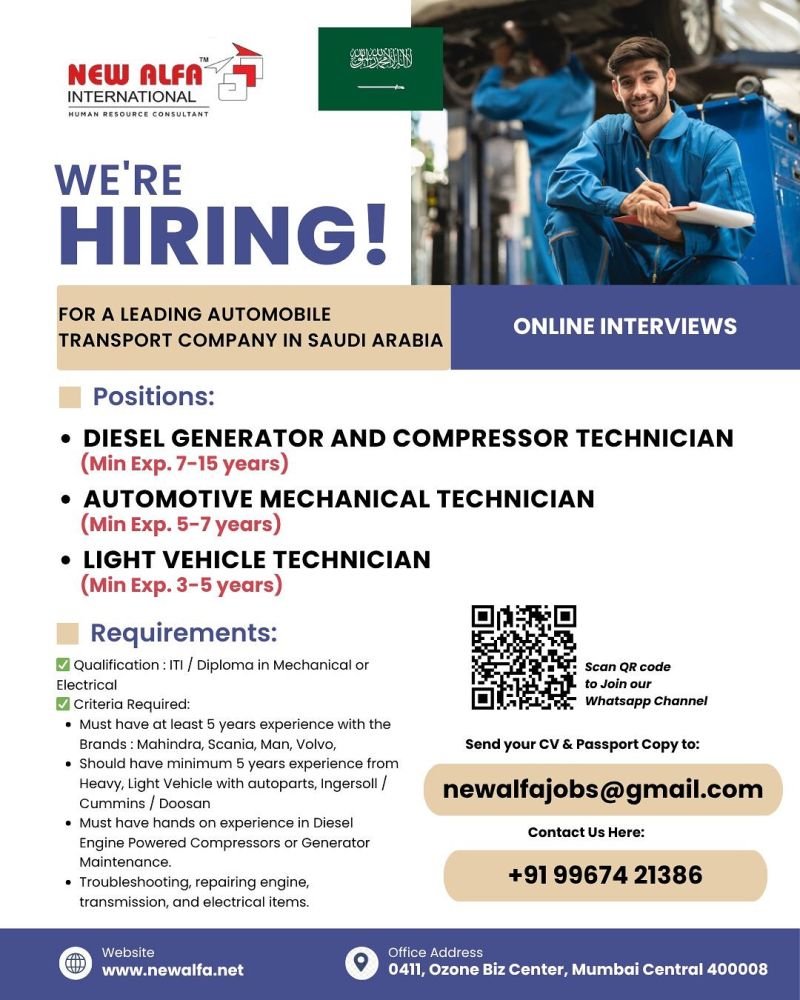 1.  Diesel Generator & Compressor Technician (Min 7–15 yrs exp.)