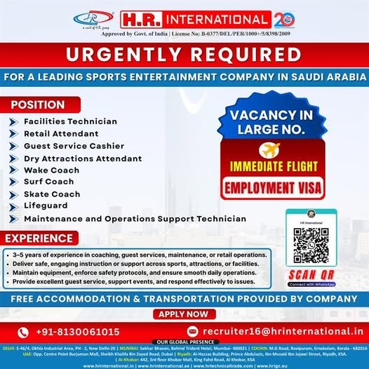 To Apply, Send CV To recruiter16@hrinternational.in or Contact: +91-8130061015