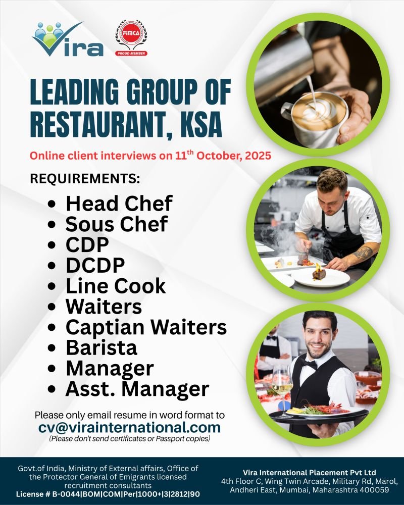 Vira International Placement Pvt Ltd is conducting online client interviews on 11th October 2025 for a leading group of restaurants in KSA. Apply now for these exciting opportunities!