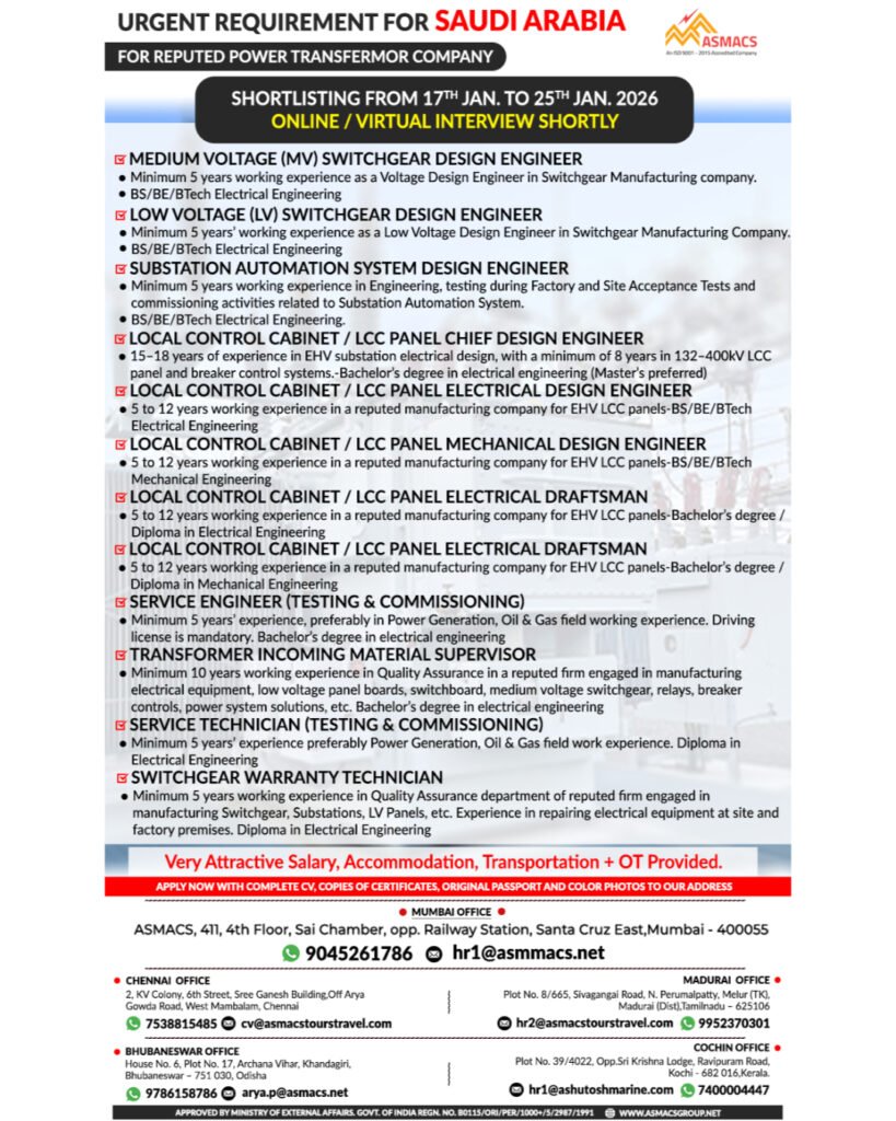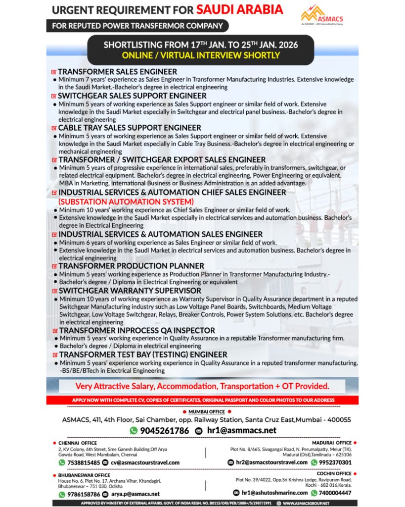 Saudi Arabia : Hiring For Power Transformer Company