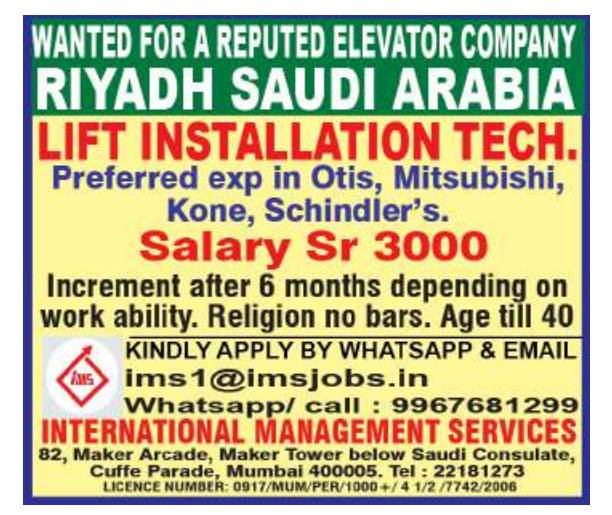 Reputed Elevator Company in Riyadh, Saudi Arabia hiring! Lift Installation Technician | Preferred exp: Otis, Mitsubishi, Kone, Schindler | SR 3000 salary | Increment after 6 months | Age up to 40 | No religion bar.