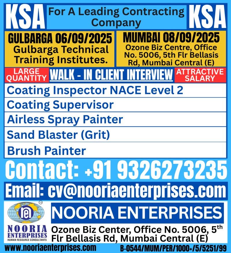 Email CV To cv@nooriaenterprises.com or Contact+91 9326273235