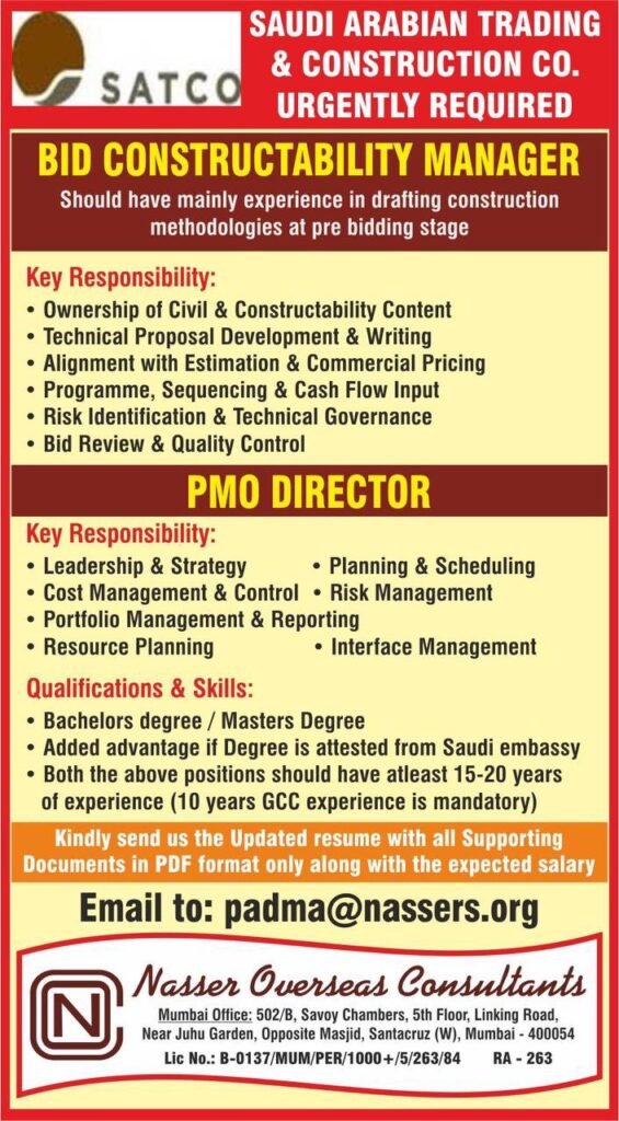 Saudi Arabian Trading & Construction Co. (SATCO) is urgently hiring experienced heavy equipment operators and drivers for ongoing construction projects in Saudi Arabia (KSA). Nasser Overseas Consultants (Licensed Recruitment Agency, Lic No: B-0137/MUM/PER/1000+/5/263/84, RA-263) is handling the manpower requirement.