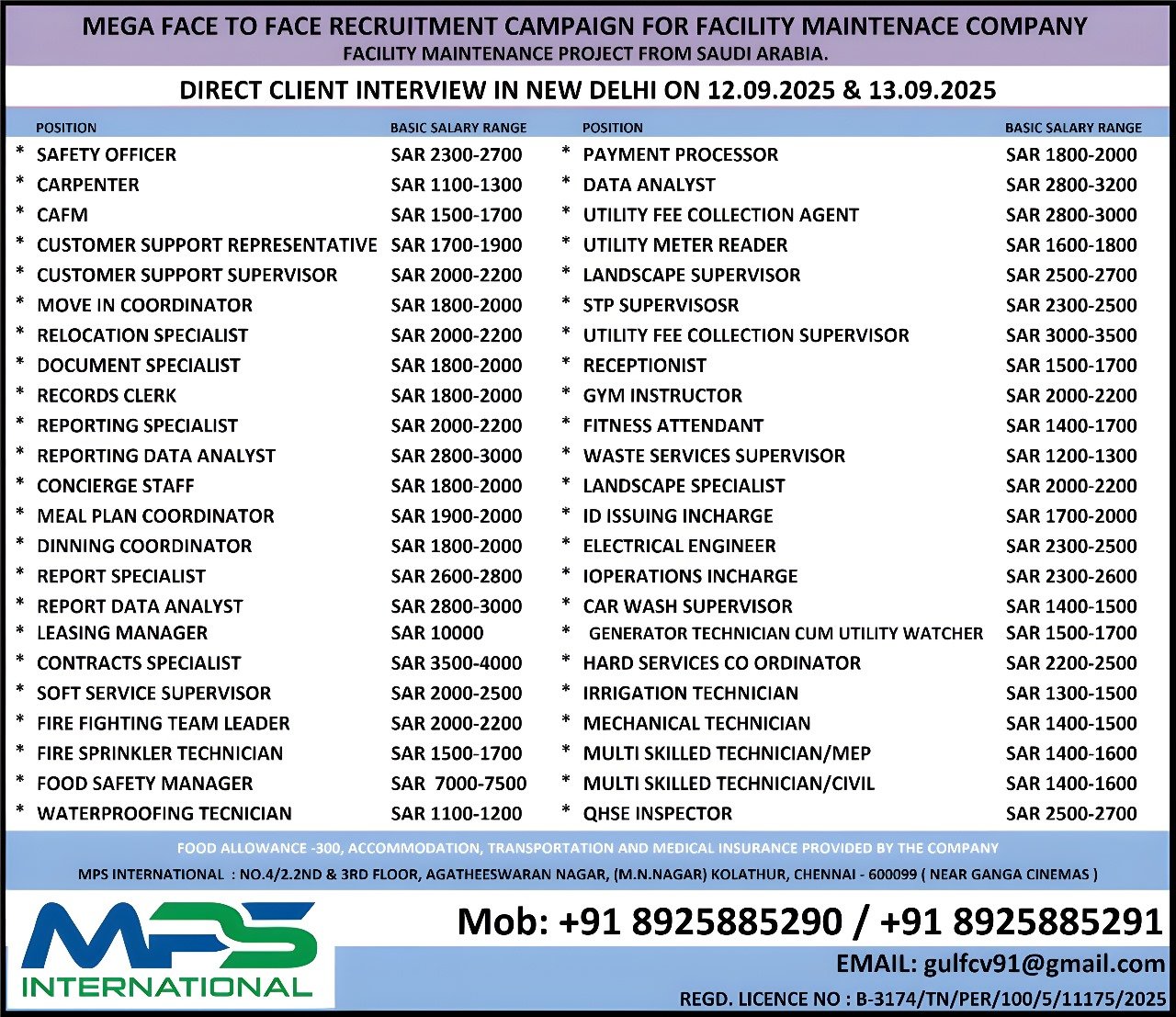 Looking for rewarding career opportunities in Saudi Arabia? MPS International is hosting a mega face-to-face recruitment campaign for a leading facility maintenance company. Direct client interviews are scheduled in New Delhi on 12th & 13th September 2025. Apply now for a variety of positions with attractive salary ranges!