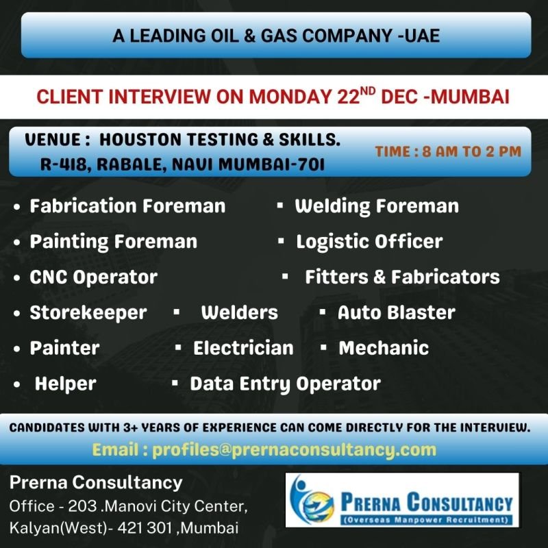 • Benefits: Food allowance – 300, Accommodation, Transportation, and Medical Insurance provided by the company