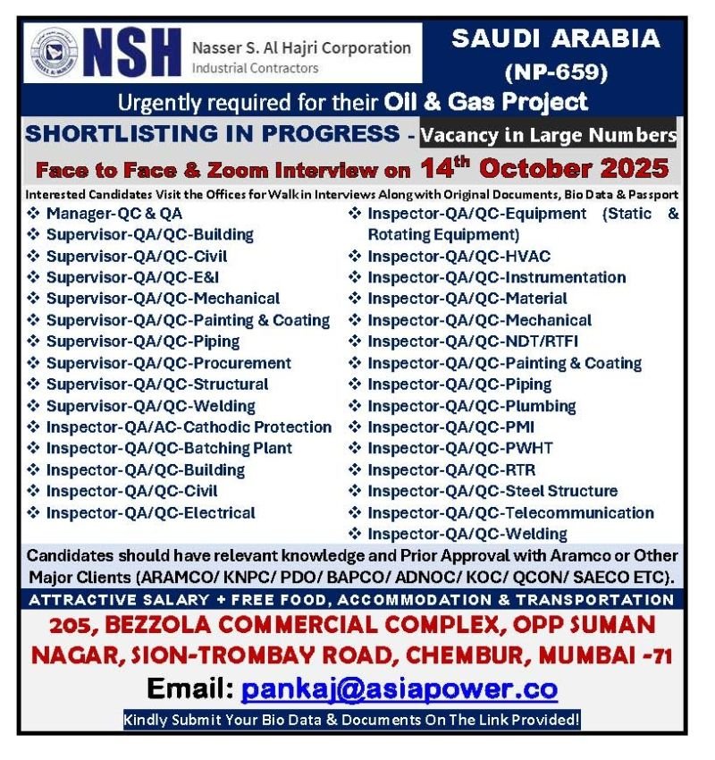 Saudi Arabia – Large Job Vacancies For NSH Oil & Gas Project