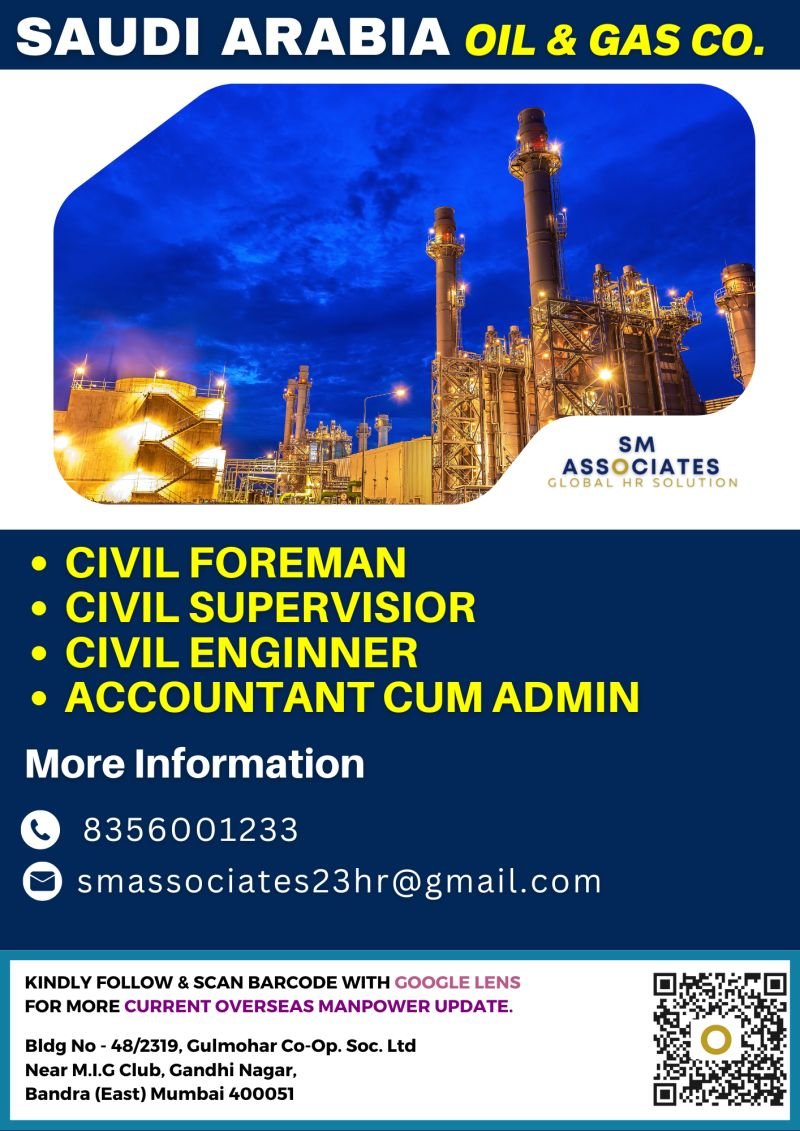 Looking for exciting career opportunities in the oil and gas industry? Saudi Arabia Oil & Gas Co., in collaboration with SM Associates Global HR Solution, is hiring for multiple roles. Explore vacancies for Civil Foreman, Civil Supervisor, Civil Engineer, and Accountant cum Admin positions. Apply today and kickstart your career in one of the world’s leading energy sectors!
