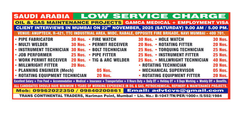 Urgent Hiring with Low Service Charge! Saudi Arabia Oil & Gas Maintenance Projects – Client Interviews in Mumbai on 22nd November 2025 (Saturday) from 9:00 AM to 5:00 PM. GAMCA Medical + Employment Visa included.