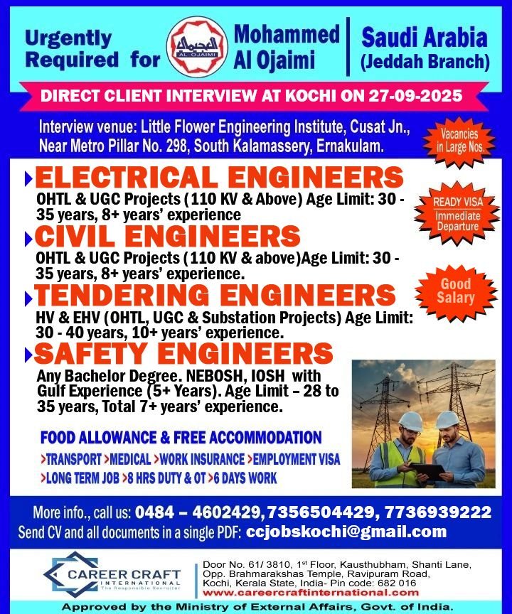 Are you an experienced Electrical Engineer, Civil Engineer, Tendering Engineer, or Safety Engineer looking for exciting career opportunities? Mohammed Al Ojaimi (Jeddah Branch), Saudi Arabia, is urgently hiring for various engineering roles. Direct client interviews are scheduled for September 27, 2025, in Kochi, India. Don’t miss this chance to work on high-voltage (HV) and extra-high-voltage (EHV) projects with excellent benefits!