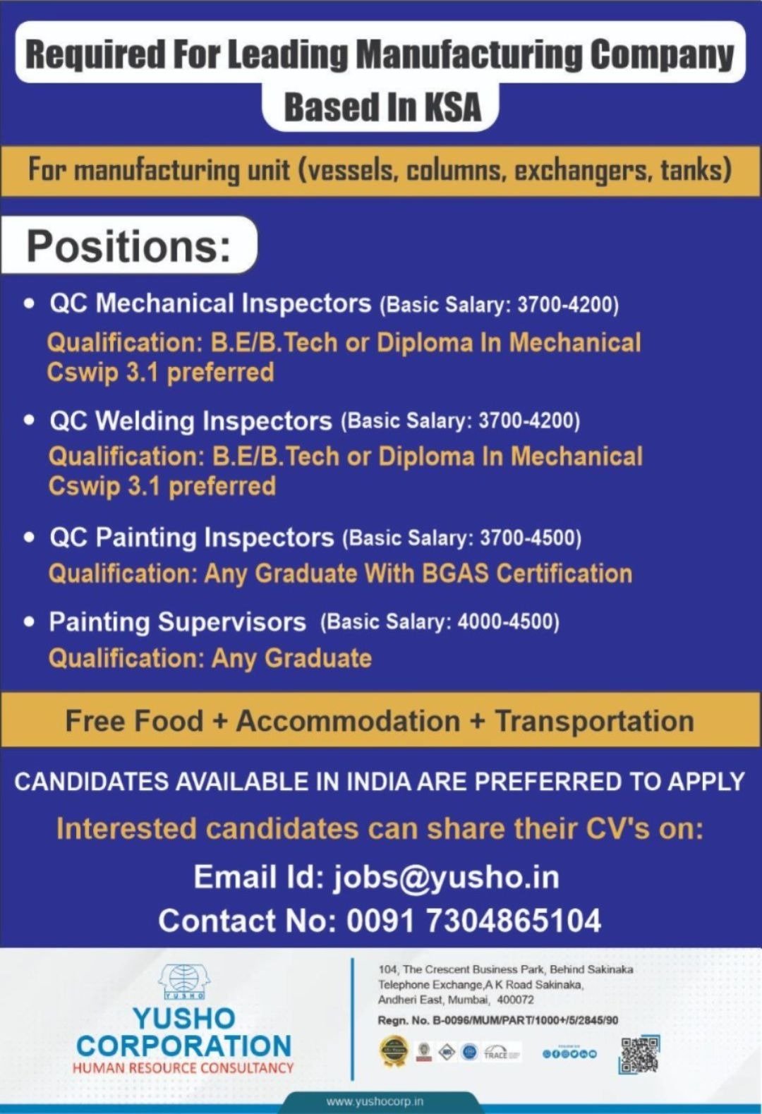 Urgent Hiring for a top manufacturing company in Saudi Arabia specializing in pressure vessels, columns, heat exchangers, and tanks. Free Food + Accommodation + Transportation | Indian candidates preferred.