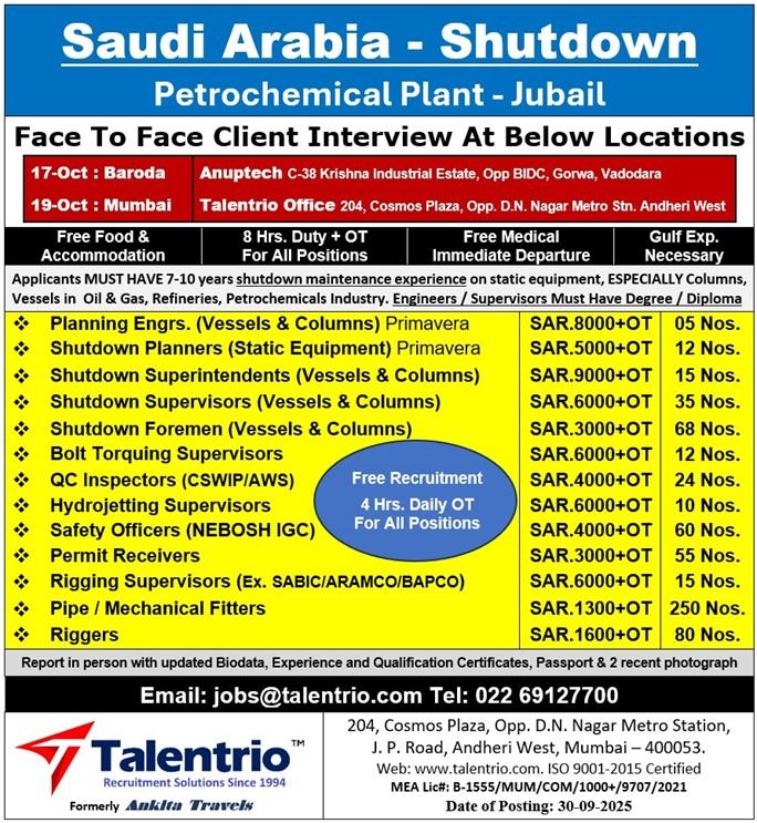 Talentrio, formerly Ankita Travels, is conducting a free recruitment drive for a shutdown at a leading petrochemical plant in Jubail, Saudi Arabia. Face-to-face client interviews are scheduled for October 17, 2025, in Baroda and October 19, 2025, in Mumbai. Apply now!