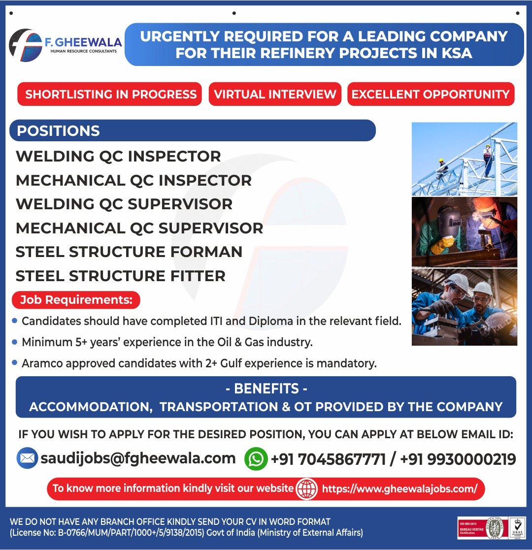 F. Gheewala Human Resource Consultants is urgently hiring for leading refinery projects in KSA. With shortlisting in progress and virtual interviews underway, this is an excellent opportunity for skilled professionals. Apply today!