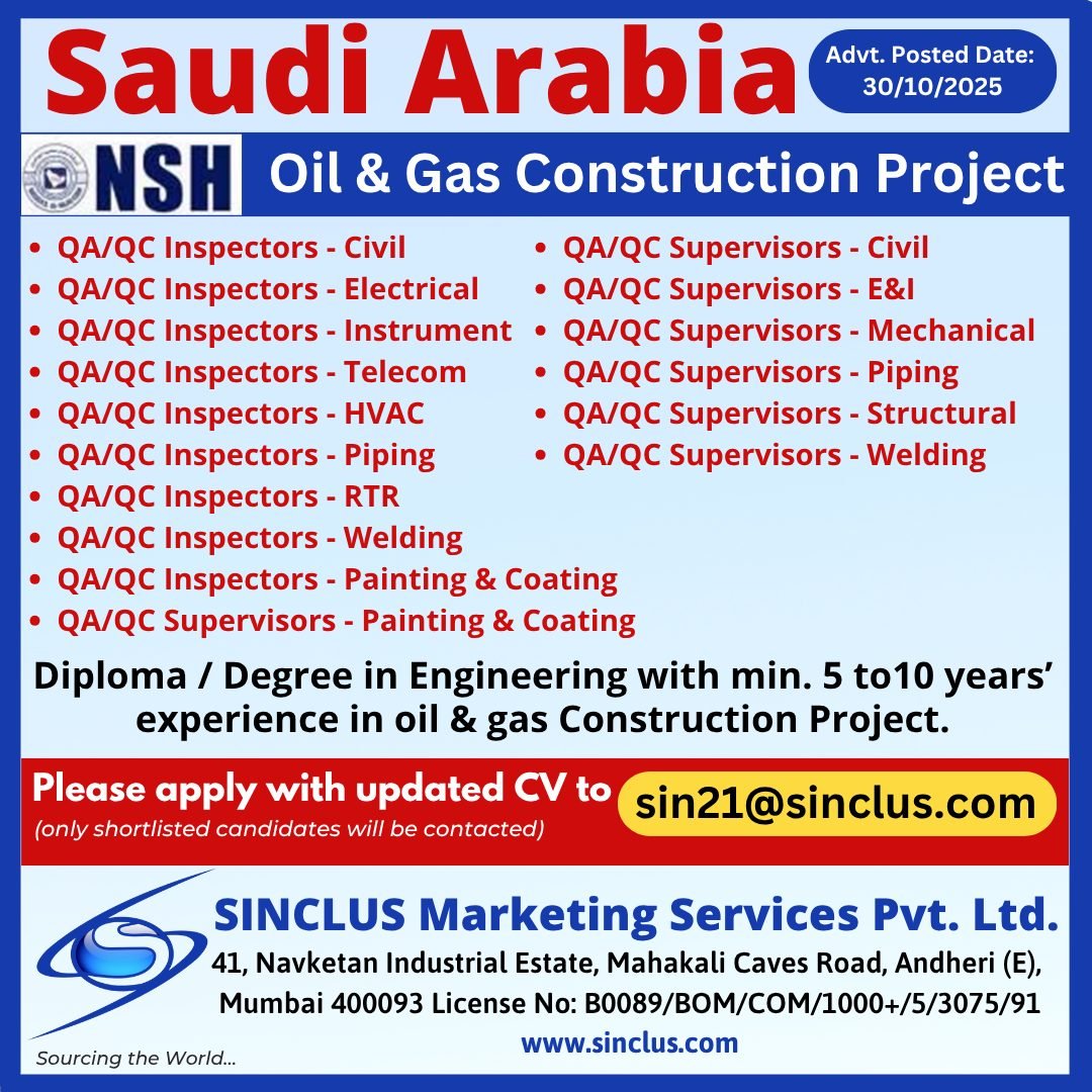 Urgent Recruitment! NSH – Leading Oil & Gas Construction Project in Saudi Arabia requires QA/QC Professionals. Posted: 30/10/2025 | Diploma/Degree + 5–10 Years Exp Mandatory.