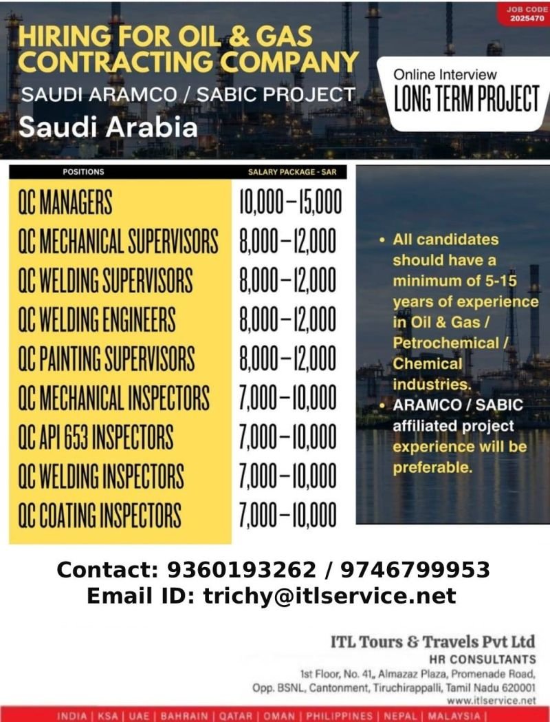 FREE RECRUITMENT | High Salary | Food + Accommodation + OT Provided One of the largest Oil & Gas contracting companies executing Aramco & SABIC Projects in Saudi Arabia is urgently hiring experienced QC professionals for long-term positions.