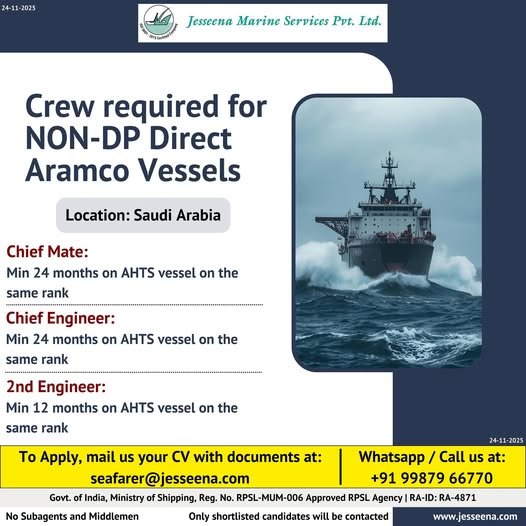 Saudi Arabia : Crew required for NON-DP Direct Aramco Vessels