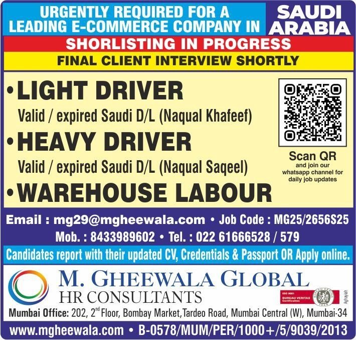 Free Recruitment! A leading Oil & Gas company in Saudi Arabia is urgently recruiting experienced professionals for a Shutdown Project. M. Gheewala Global HR Consultants, a trusted ISO-certified agency, announces shortlisting in progress with pre-screening and final client interviews scheduled soon.