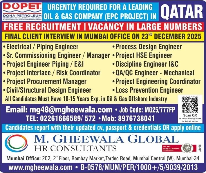 Free Recruitment for Qatar: DOPET Oil & Gas EPC Project – Large Vacancies