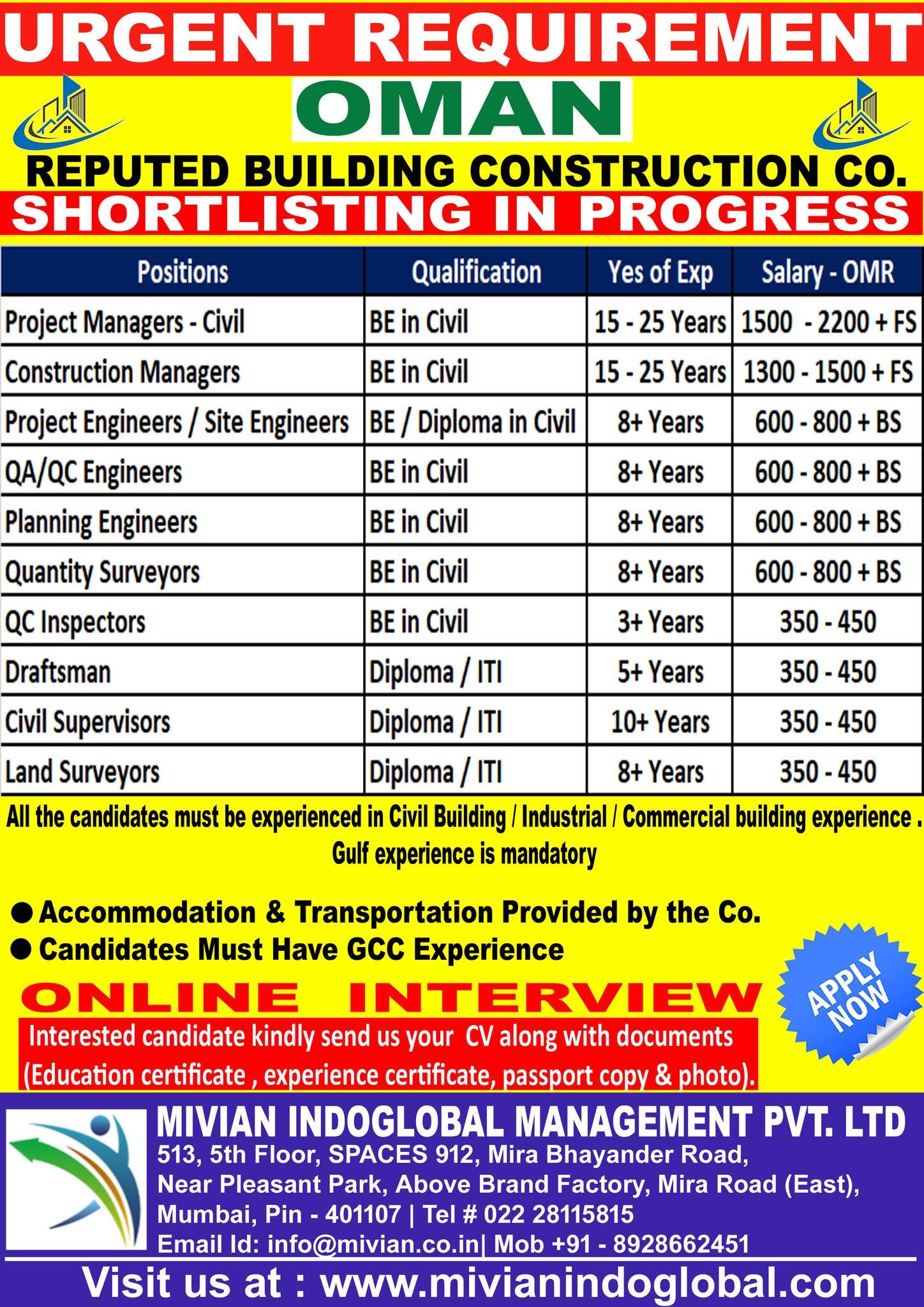 Urgent Job Openings in Oman with Reputed Construction Co. – Apply Now!
