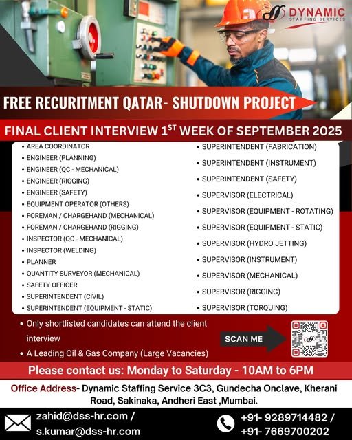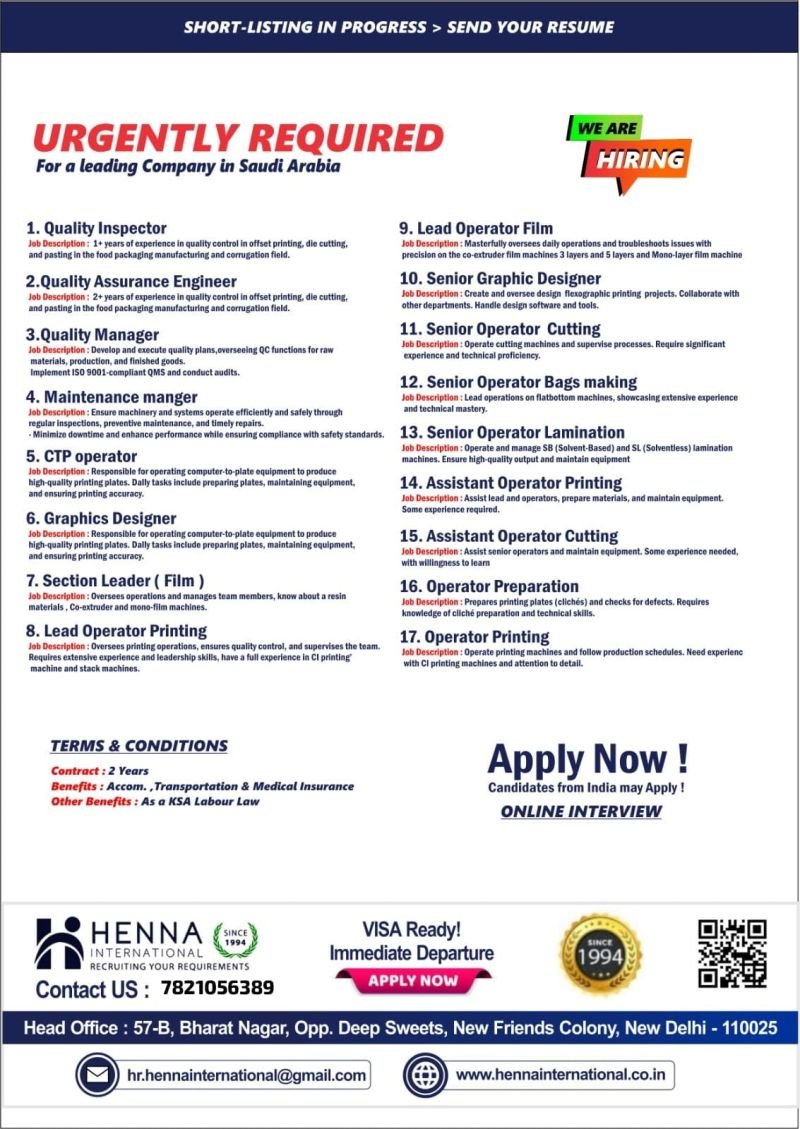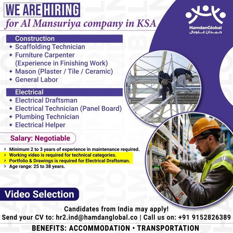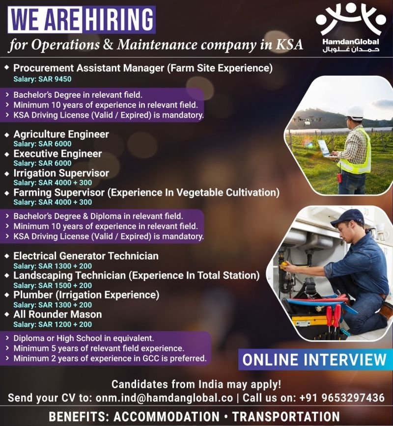 Recruitment for Operations & Maintenance company in Saudi Arabia