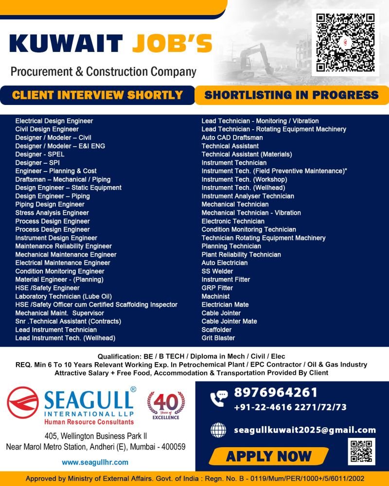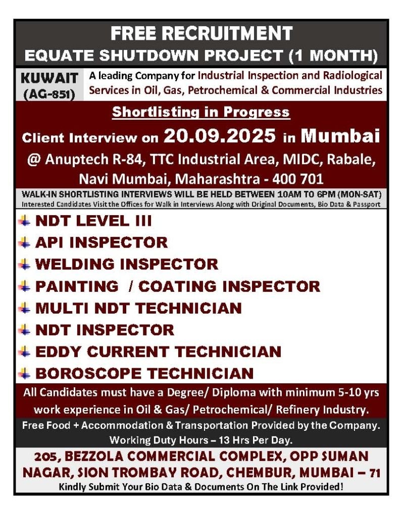 Kuwait – Hiring For leading company specializing in industrial inspection and radiological services for oil, gas, petrochemical, and commercial industries
