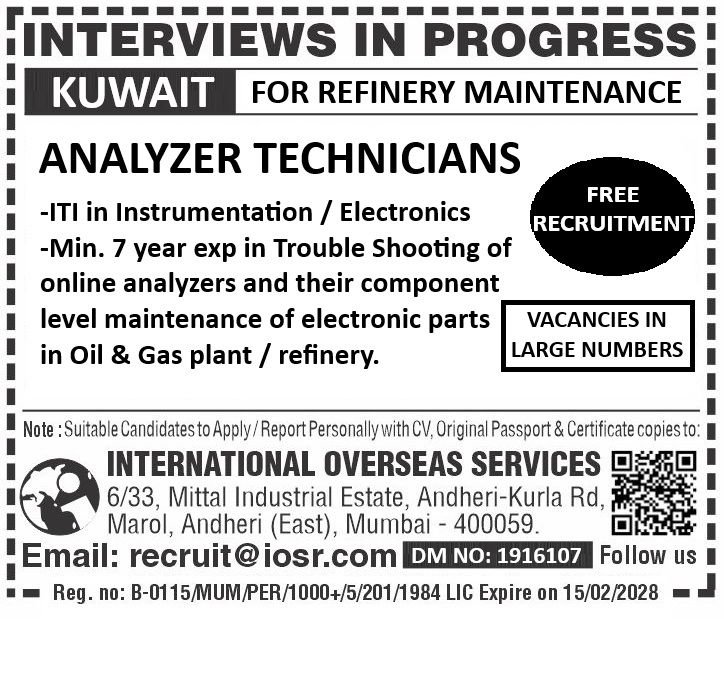 Hiring Analyzer Maintenance Technicians For Kuwait Refinery Maintenance