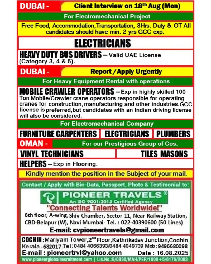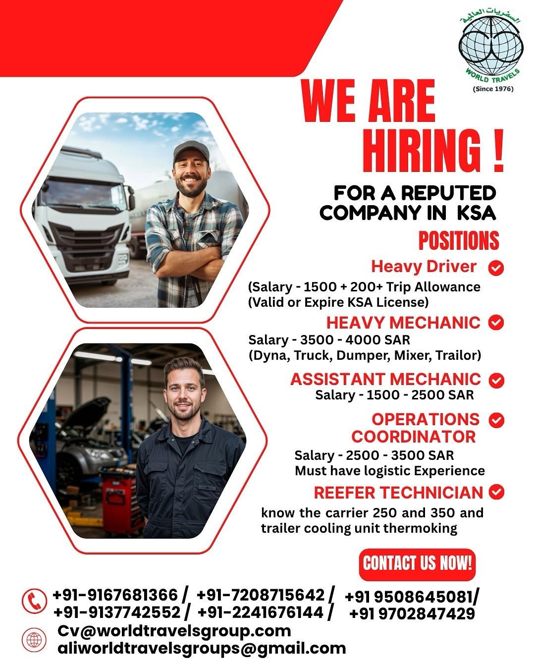 Saudi Arabia – Hiring Mechanics, Electricians & Welders Requirement