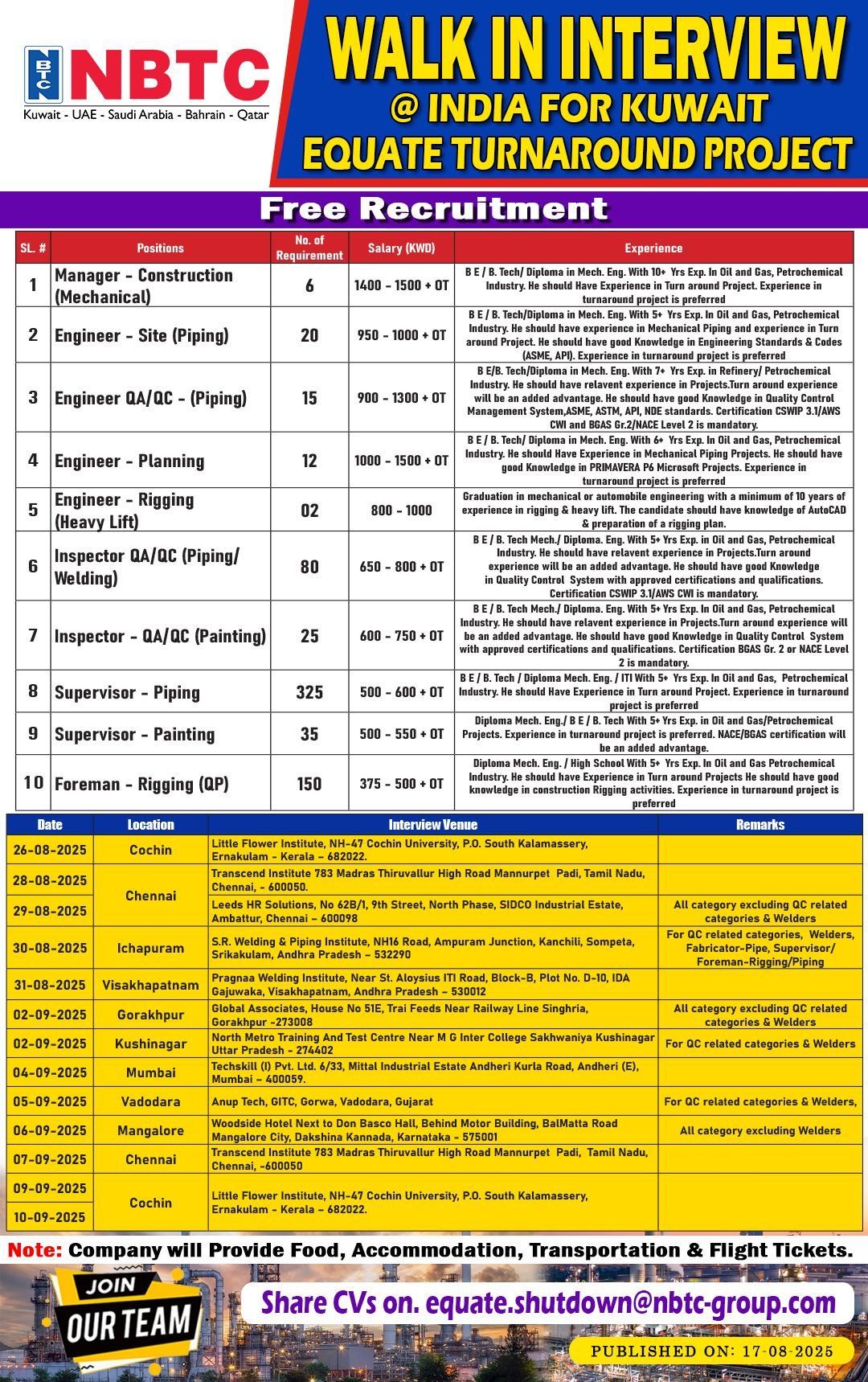 Jobs in Kuwait: Walk-In Interviews Across India for Equate Turnaround Project with NBTC Group