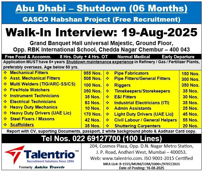 UAE Jobs – Walk-In Interview for GASCO Habshan Shutdown Jobs in Abu Dhabi – Aug 19, 2025
