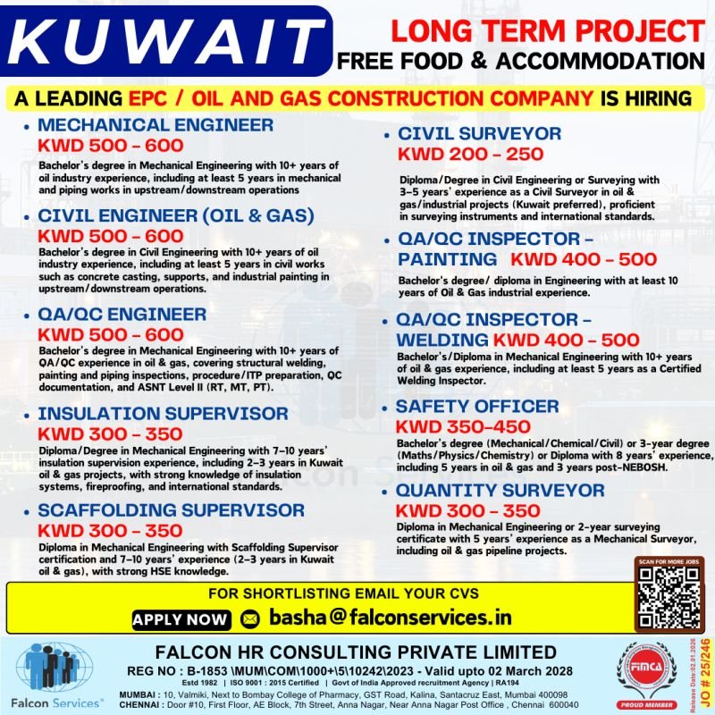 Long Term Jobs in Kuwait 2026: Leading EPC Oil & Gas Company Hiring Engineers & Supervisors – Free Food & Accommodation