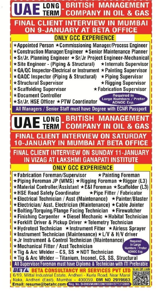Large Vacancies in Dubai 2026: Oil & Gas and Building Construction Projects – Final Client Interview in Mumbai on 10th January