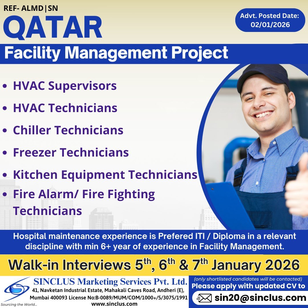 Hiring for Qatar Facility Management Project – HVAC, Chiller & Fire Fighting Technicians Wanted