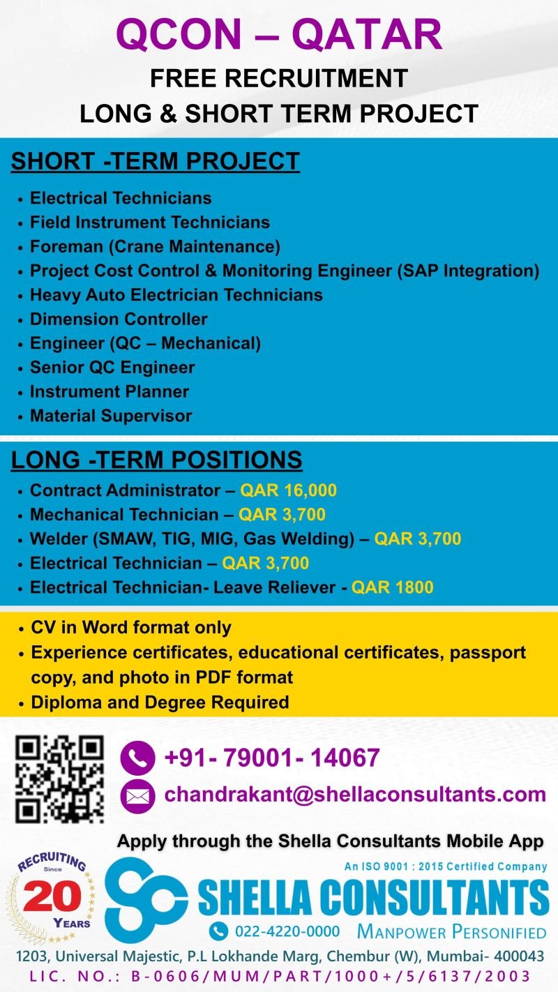 Qatar Jobs 2026: QCON Free Recruitment – Long & Short Term Projects | High Salaries up to QAR 16,000!