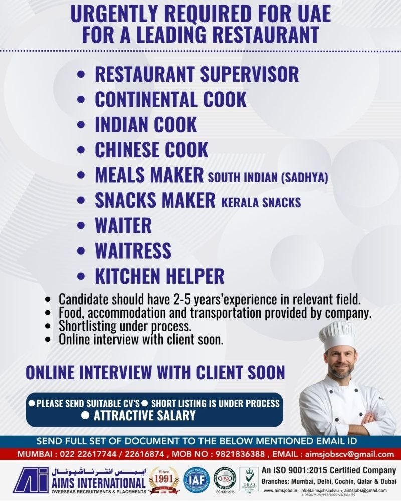 Jobs in UAE: Leading Restaurant Hiring Cooks, Waiters & Supervisors (Free Food + Accommodation)