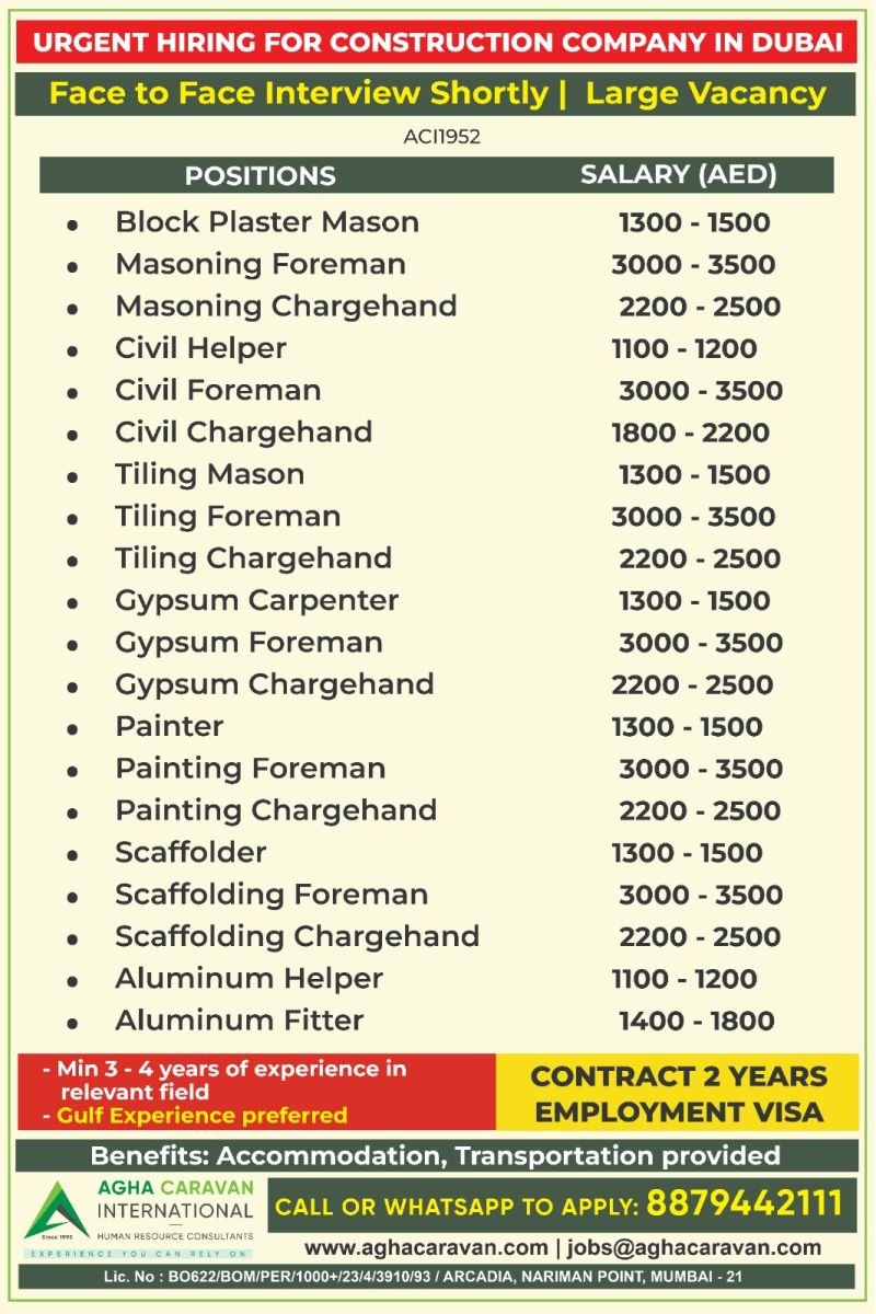 UAE Jobs – Huge requirement for a leading Construction Company in Dubai ​​​​​​​