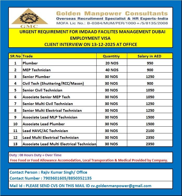 Urgent Dubai Jobs – Leading MEP Company | Large Vacancies | Client Interview on 11th Dec 2025