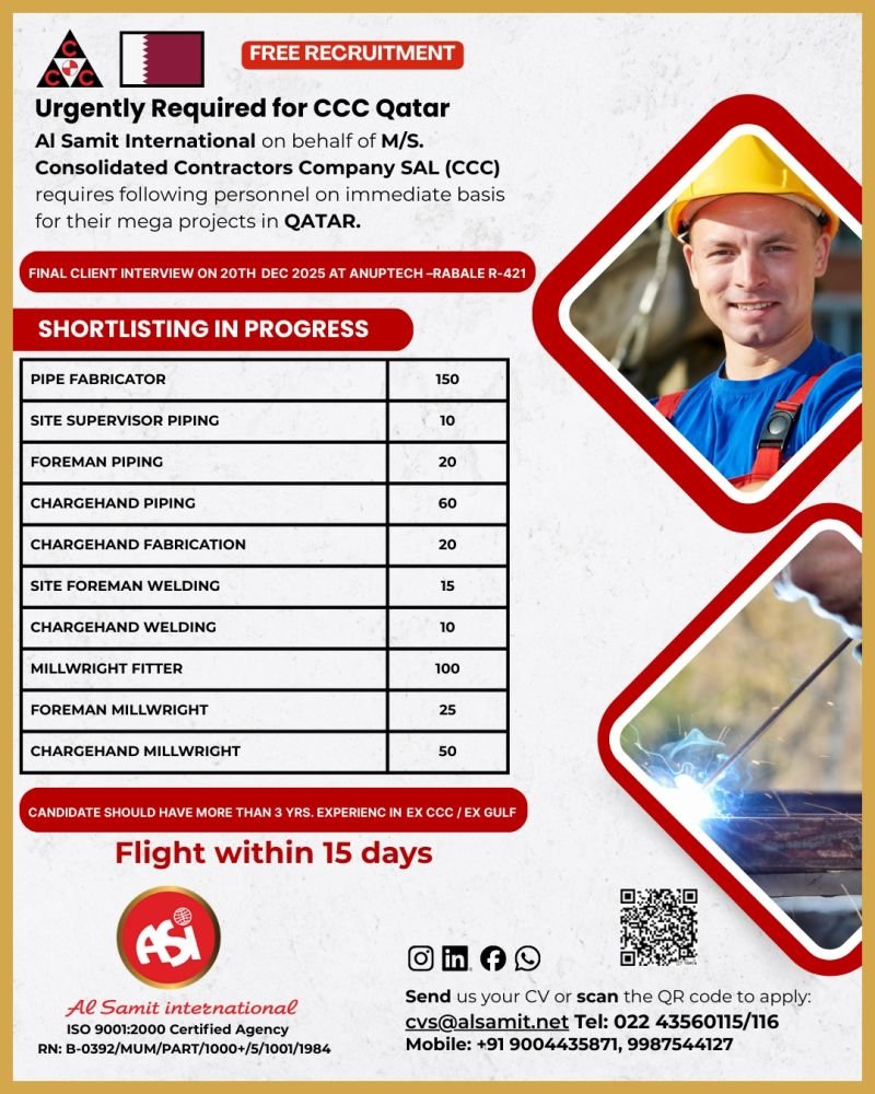 Urgent Hiring for CCC Qatar | Free Recruitment | 500+ Vacancies