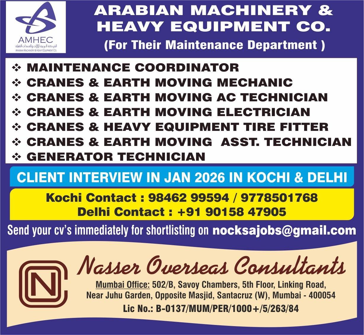 Saudi Arabia : Urgent Jobs at Arabian Machinery & Heavy Equipment Co. (AMHEC) – Maintenance Department