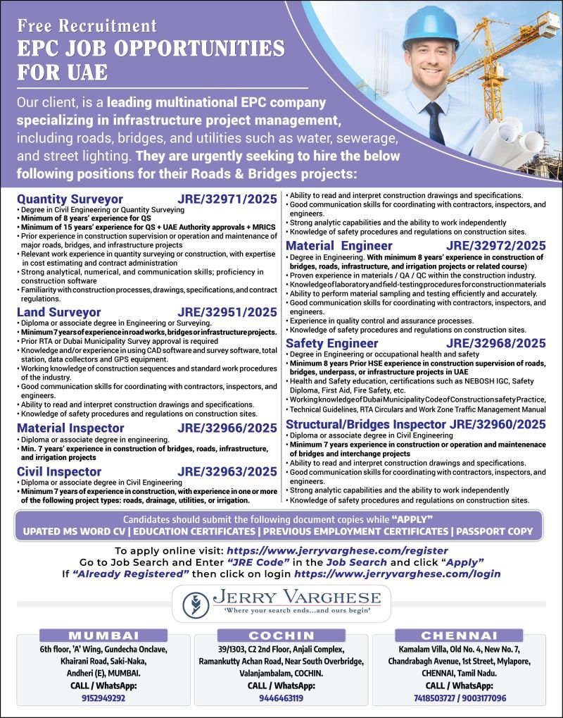 UAE EPC Roads & Bridges Jobs: Quantity Surveyor, Material Engineer, Safety Engineer & More – Free Recruitment!