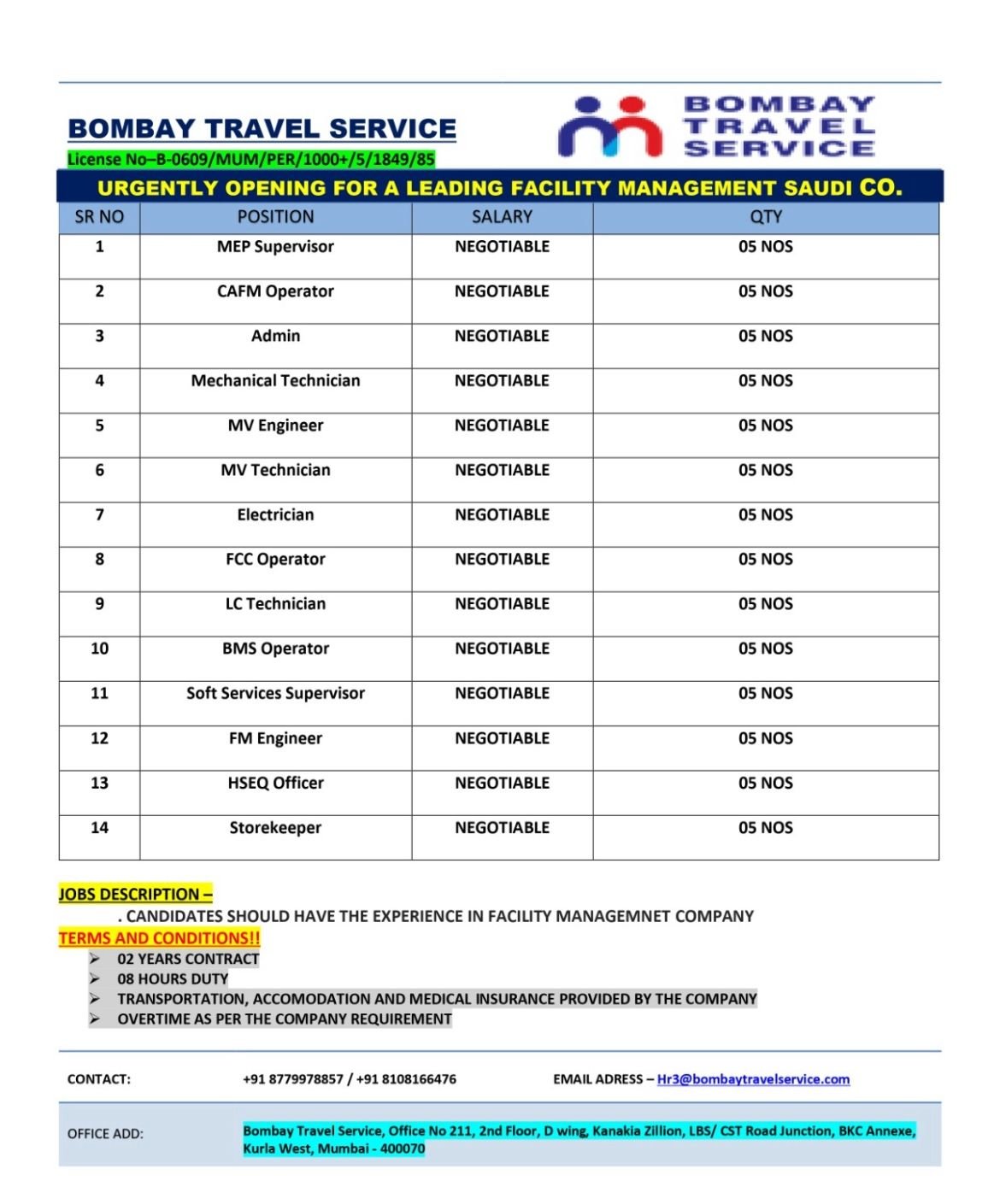 Urgent Facility Management Jobs in Saudi Arabia – 14 Roles | Negotiable Salary